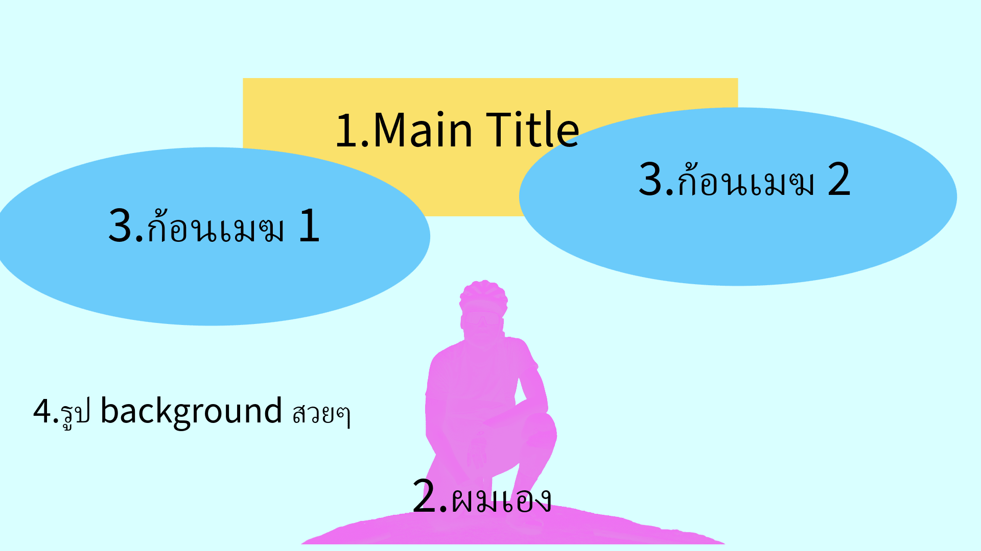 ต่อไปเพื่อเพิ่มสีสันให้มากยิ่งขึ้นเราก็ไปหารูปก้อนเมฆมาซึ่งผมเราต้องการให้ก้อนเมฆมันโปร่งแสง สุดท้ายผมก็ได้รูปนี้มา แต่ตามแผนแล้วเราจะใช้ก้อนเมฆสองก้อนแต่เราสามารถใช้เทคนิคขยายมัน(CSS scaleX) ให้มันมีสัดส่วนที่แตกต่างกันไป ก็จะทำให้ก้อนเมฆดูเป็นคนละก้อนกันแล้วและยังทำให้เว็บไม่ต้องโหลดภาพมากจนเกินไปอีกด้วย